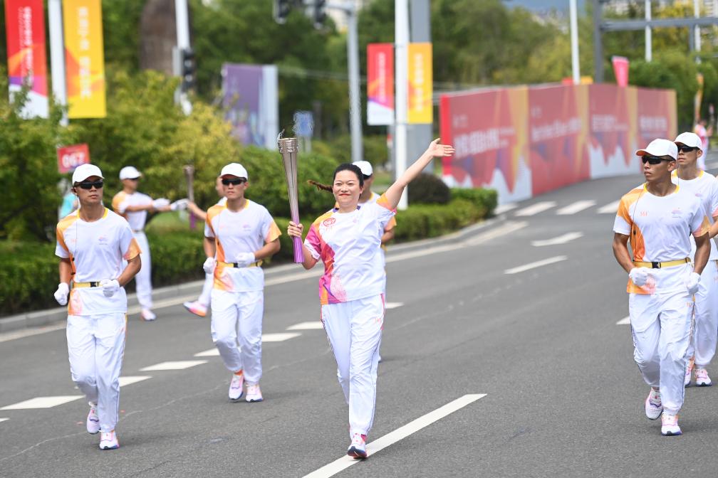 9月8日,火炬手羅雪娟在火炬?zhèn)鬟f中。當日,杭州亞運會火炬?zhèn)鬟f在杭州西湖涌金公園廣場啟動。新華社記者翟健嵐攝