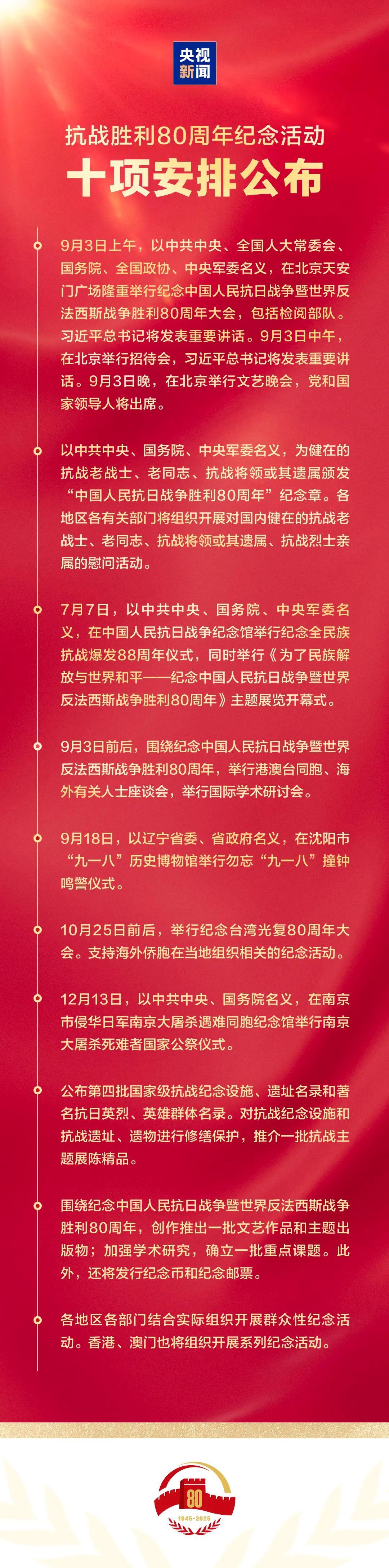 今天上午,國新辦舉行新聞發(fā)布會,介紹了紀(jì)念活動總體安排。主要的活動安排,共有十項(xiàng)。習(xí)近平總書記將出席紀(jì)念中國人民抗日戰(zhàn)爭暨世界反法西斯戰(zhàn)爭勝利80周年大會并發(fā)表重要講話。