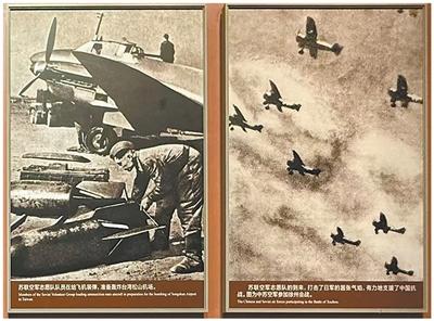 中國人民抗日戰(zhàn)爭紀(jì)念館中展示的蘇聯(lián)援華航空隊(duì)老照片。左側(cè)照片為蘇聯(lián)援華航空隊(duì)成員為飛機(jī)裝彈,準(zhǔn)備轟炸被日軍占領(lǐng)的臺(tái)北松山機(jī)場。右側(cè)照片為1938年中蘇空軍參加徐州會(huì)戰(zhàn)。