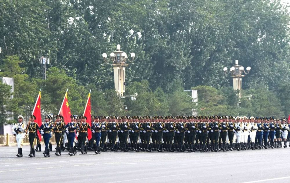 儀仗方隊(duì)護(hù)衛(wèi)黨旗、國(guó)旗、軍旗,3日上午第一個(gè)走過(guò)天安門(mén)廣場(chǎng),接受祖國(guó)和人民檢閱。