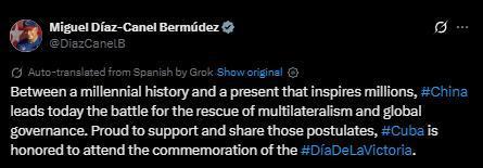 迪亞斯-卡內(nèi)爾在社交媒體上發(fā)文稱(chēng),"在綿延千年的歷史與激勵(lì)億萬(wàn)人的當(dāng)下之間,中國(guó)今日引領(lǐng)捍衛(wèi)多邊主義與全球治理的斗爭(zhēng)。古巴為支持并踐行這些理念而自豪,并榮幸出席勝利日紀(jì)念活動(dòng)。"