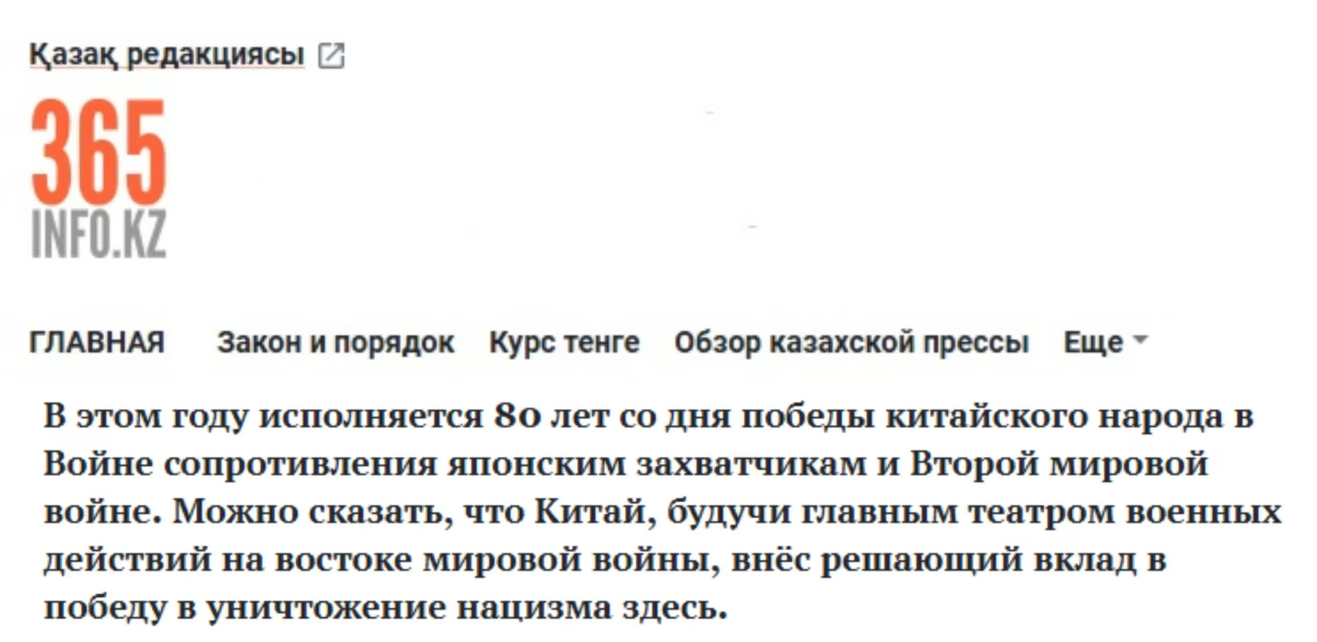 哈薩克斯坦"365信息"新聞網(wǎng)近日刊文稱(chēng),今年是中國(guó)人民抗日戰(zhàn)爭(zhēng)暨世界反法西斯戰(zhàn)爭(zhēng)勝利80周年。可以說(shuō),中國(guó)作為東方主戰(zhàn)場(chǎng),為世界反法西斯戰(zhàn)爭(zhēng)勝利作出決定性貢獻(xiàn)。