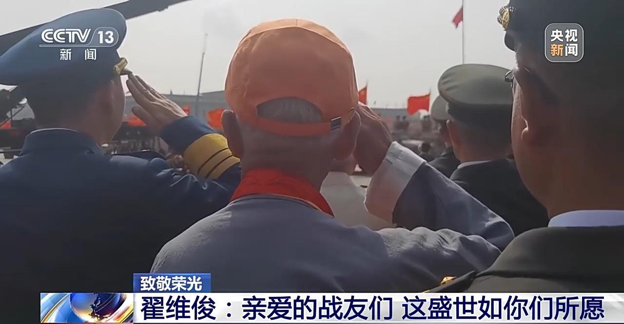 9月3日,當(dāng)精良武器裝備經(jīng)過(guò)天安門城樓接受檢閱時(shí)。觀禮臺(tái)上,99歲的支前模范翟維俊敬軍禮,向受閱方隊(duì)致敬。