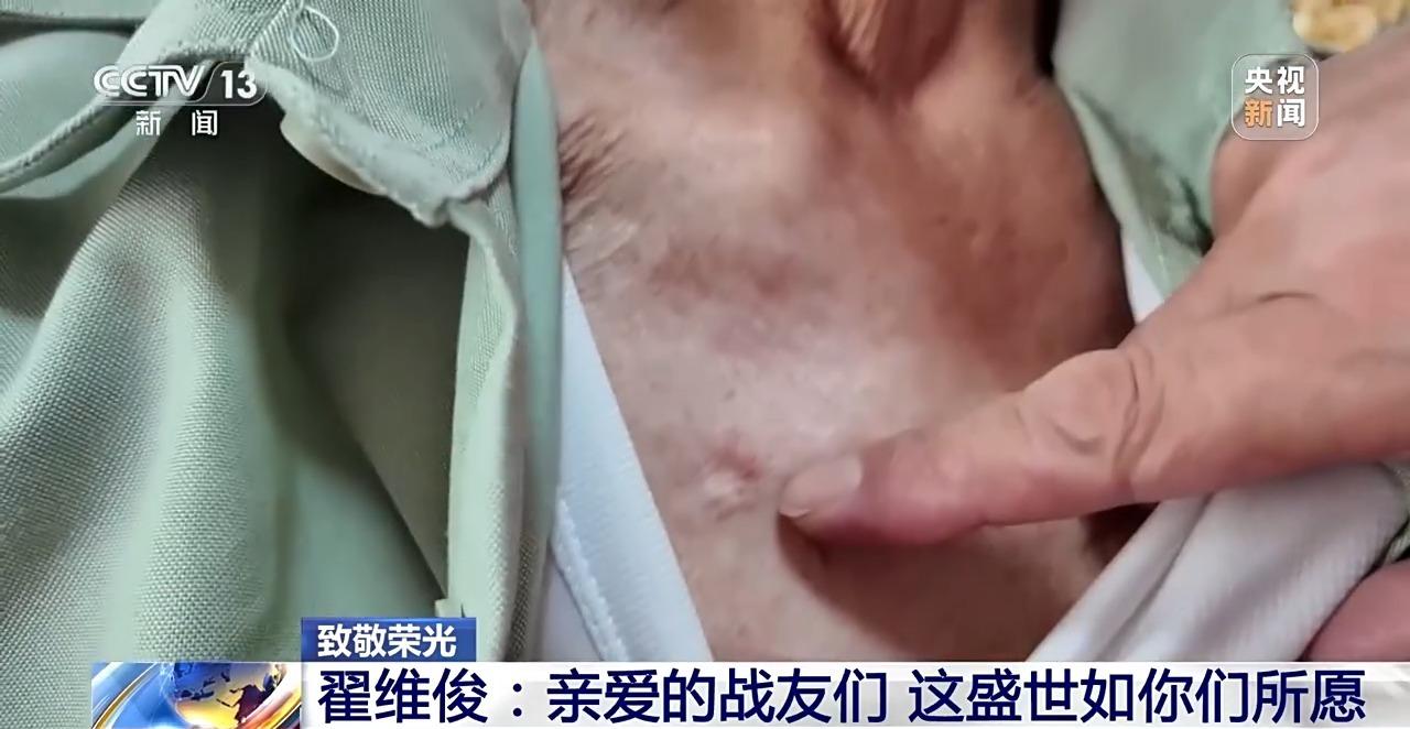 抗戰(zhàn)支前模范 翟維俊:我代替我們犧牲的戰(zhàn)友和同志們看到了這個(gè)和平盛世,也看到了我們新時(shí)代強(qiáng)大的新中國(guó),我高興、自豪。 參加現(xiàn)場(chǎng)觀禮的幾天前,在北京朝陽(yáng)區(qū)永安里的這間簡(jiǎn)樸老屋內(nèi),我們見(jiàn)到了翟維俊,聽(tīng)他講述親歷的烽火歲月。提起曾經(jīng)的戰(zhàn)斗經(jīng)歷,老人解開(kāi)幾顆衣服扣子,右胸口一枚硬幣大小的傷疤赫然在目。