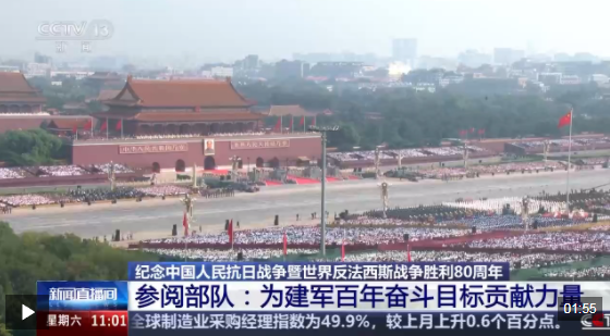 紀(jì)念中國(guó)人民抗日戰(zhàn)爭(zhēng)暨世界反法西斯戰(zhàn)爭(zhēng)勝利80周年大會(huì)9月3日隆重舉行。受閱部隊(duì)作為共和國(guó)武裝力量的代表,光榮接受了黨和人民的檢閱。中央軍委主席習(xí)近平簽署通令,嘉獎(jiǎng)參閱全體人員。廣大參閱官兵備受鼓舞,一致表示,一定不負(fù)習(xí)主席重托,為如期實(shí)現(xiàn)建軍一百年奮斗目標(biāo)、加快把人民軍隊(duì)建成世界一流軍隊(duì)不懈奮斗。