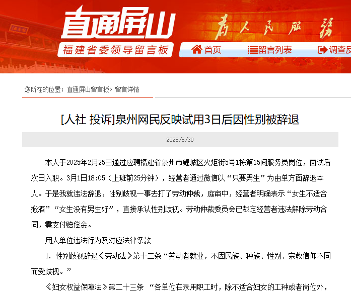 東南網(wǎng)6月13日訊(本網(wǎng)記者 陳培源 林杰)今年初,泉州網(wǎng)友陳女士應(yīng)聘泉州鯉城某酒吧服務(wù)員崗位,入職3日后,酒吧以“決定找男生”為由辭退她。經(jīng)勞動(dòng)仲裁,該酒吧被認(rèn)定為“違法解除勞動(dòng)關(guān)系”,需支付賠償金3500元以及三天的工資差額。因其時(shí)隔多日仍未履行裁決,近日,陳女士以受到性別歧視為由,向東南網(wǎng)《直通屏山》尋求幫助。【留言詳情】 員工:試用期因性別被辭退,不服! 經(jīng)了解,今年2月25日,陳女士通過(guò)某招聘平臺(tái)獲取泉州鯉城某酒吧招聘信息,與酒吧經(jīng)營(yíng)者蘇女士電話及微信溝通后,當(dāng)晚經(jīng)蘇女士面試并通過(guò)。雙方約定試用期工資為3500元/月,全勤獎(jiǎng)200元,無(wú)加班費(fèi),工作時(shí)間為18:30至次日2:30。次日,陳女士開(kāi)始到該酒吧工作,未簽訂勞動(dòng)合同,也未繳納社保。 陳女士入職3日后,蘇女士通過(guò)微信告訴她:“你晚上不用去了。經(jīng)過(guò)決定還是找男生,因?yàn)檫@個(gè)瑣事太多了,怕女孩子熬不住?!卑凑彰嬖嚂r(shí)雙方約定的“若未通過(guò)試用按兼職1天100元支付工資”,蘇女士向陳女士轉(zhuǎn)賬300元。 陳女士不服蘇女士的辭退理由,于4月21日向泉州市鯉城區(qū)勞動(dòng)人事?tīng)?zhēng)議仲裁委員會(huì)申請(qǐng)勞動(dòng)仲裁,要求酒吧支付違法解除勞動(dòng)合同的賠償金3500元及三天試用期的工資差額103.84元。泉州市鯉城區(qū)勞動(dòng)人事?tīng)?zhēng)議仲裁委員會(huì)受理后,于5月16日組成仲裁庭公開(kāi)開(kāi)庭審理。5月27日,泉州市鯉城區(qū)勞動(dòng)人事?tīng)?zhēng)議仲裁委員會(huì)出具裁決書(shū),支持陳女士的仲裁請(qǐng)求。 老板:用人3天判賠一月工資,冤枉! 6月10日,東南網(wǎng)記者向該酒吧經(jīng)營(yíng)者蘇女士了解了情況。蘇女士表示,在陳女士入職前兩天她也招聘了一名男員工。相比之下,這名男員工比陳女士工作積極性更高,眼里更有活,更勤快。經(jīng)過(guò)權(quán)衡對(duì)比,蘇女士決定留下男員工。辭退陳女士時(shí)的理由只是委婉的說(shuō)法,不存在性別歧視?!懊嬖嚂r(shí)對(duì)試用期、試用工資都說(shuō)得很清楚,我也按照面試時(shí)的約定支付了工資,不明白為什么還要告我違反勞動(dòng)法,感覺(jué)很冤枉!”蘇女士說(shuō)。 不過(guò),陳女士認(rèn)為,這些都是蘇女士的狡辯說(shuō)辭。陳女士說(shuō):“面試時(shí)是說(shuō)招前臺(tái),但上班的時(shí)候給我派了很多活,前臺(tái)、后廚、傳菜、清潔,什么活都要干?!? 蘇女士也向記者展示了2月25日兩人的微信聊天記錄,陳女士詢問(wèn)工作具體內(nèi)容,蘇女士回答:“工作內(nèi)容很簡(jiǎn)單,比如說(shuō)客人進(jìn)來(lái)(接待一下),然后對(duì)團(tuán)購(gòu)的酒核銷、上酒??腿俗吡?,把桌子收拾一下。中途,客人需要加酒的話,就給他們上上去?!? 針對(duì)仲裁結(jié)果,蘇女士表示無(wú)奈。“作為用人單位,我們也不確定她能否被錄用,所以肯定不會(huì)第一天進(jìn)去就簽合同,畢竟是服務(wù)行業(yè)。既然仲裁下來(lái)了,我也沒(méi)辦法,判我給一個(gè)月工資,我也得給?!碧K女士表示,將盡快支付。目前陳女士仍未收到相關(guān)賠付。 律師:不能合理解釋辭退理由,違法! 北京盈科(泉州)律師事務(wù)所高級(jí)合伙人肖歷美律師表示,用人單位應(yīng)當(dāng)遵循《中華人民共和國(guó)勞動(dòng)法》《中華人民共和國(guó)勞動(dòng)合同法》等法律法規(guī)的規(guī)定,勞動(dòng)關(guān)系存續(xù)期間,用人單位不得違法解除勞動(dòng)合同,否則應(yīng)按法律規(guī)定承擔(dān)支付補(bǔ)償金、賠償金、補(bǔ)足工資差額等法律責(zé)任。如果蘇女士認(rèn)為陳女士在試用期間不符合錄用條件,可以要求解除勞動(dòng)合同。但她以“瑣事太多、怕女孩子熬不住”為辭退理由,這個(gè)理由不符合法律規(guī)定。而且,蘇女士在面試期間并未明確約定錄用條件和崗位要求,雙方亦未簽訂書(shū)面勞動(dòng)合同進(jìn)行約定,蘇女士不能合理解釋陳女士為何不符合工作要求,直接辭退陳女士,則屬于違法解除勞動(dòng)合同。 肖歷美律師表示,用人單位招聘、用工都應(yīng)當(dāng)嚴(yán)格遵守法律法規(guī)規(guī)定,并應(yīng)當(dāng)重視用工前的招聘程序,發(fā)布招聘公告時(shí),需清楚寫明崗位名稱和要求、錄用條件、工資標(biāo)準(zhǔn)、上班時(shí)間等內(nèi)容。員工入職時(shí),也應(yīng)當(dāng)及時(shí)與員工簽訂書(shū)面勞動(dòng)合同,明確約定工作時(shí)間、工作內(nèi)容、工資發(fā)放標(biāo)準(zhǔn)、試用期限、考核要求等事項(xiàng)。法律法規(guī)明確規(guī)定了解除勞動(dòng)合同的不同事由和相應(yīng)責(zé)任,用人單位也應(yīng)當(dāng)充分了解,合法合規(guī)用工。 肖歷美律師提示,本案已經(jīng)勞動(dòng)仲裁委員會(huì)裁決,如果用人單位未按裁決履行,陳女士有權(quán)向人民法院申請(qǐng)強(qiáng)制執(zhí)行。 |