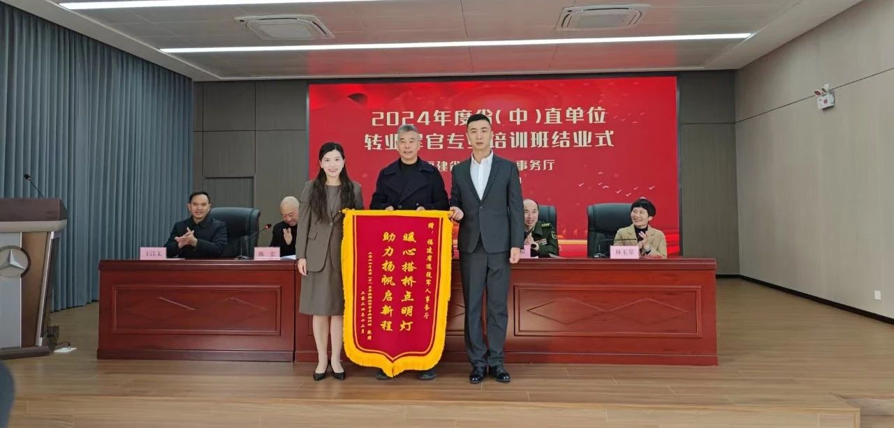 結(jié)業(yè)式上,與會領(lǐng)導(dǎo)為優(yōu)秀學(xué)員頒發(fā)榮譽證書。學(xué)員代表向主辦單位贈送了書寫“暖心搭橋點明燈,助力揚帆啟新程”的錦旗,以對培訓(xùn)班取得的豐碩成果表示感謝。 學(xué)員代表郭佳奇作了結(jié)業(yè)發(fā)言,他表示本次培訓(xùn)是一次難得的“充電”“加油”。通過培訓(xùn),提升了理論素養(yǎng)和業(yè)務(wù)能力,在新的崗位上將開好頭、定好位、起好步,將繼續(xù)發(fā)揚部隊的優(yōu)良作風(fēng),做到退役不褪色、轉(zhuǎn)業(yè)不轉(zhuǎn)志,主動投身地方經(jīng)濟建設(shè)。 |