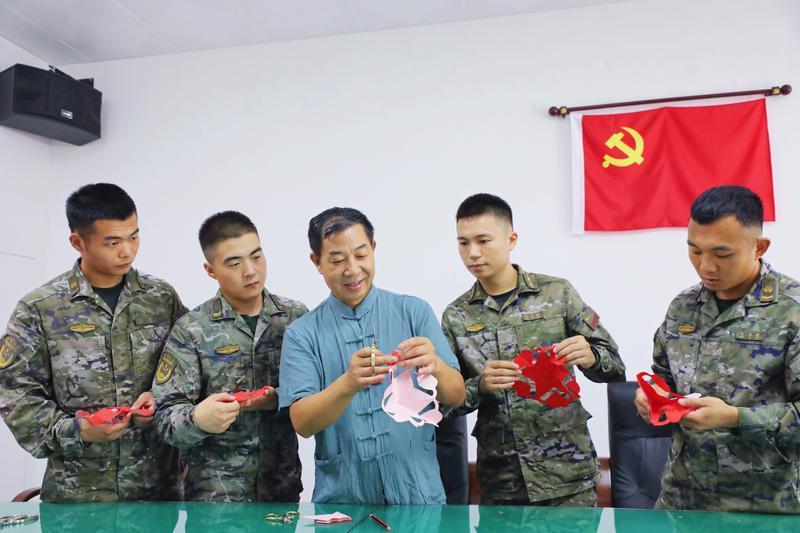 7月31日,在三明市寧化縣舉辦的“文化進萬家——非遺進軍營暨慶祝八一建軍節(jié)”主題活動中,客家剪紙縣級非遺傳承人張仁鍛與武警三明支隊寧化中隊官兵一同剪制“五角星”“軍徽”等圖案?,F(xiàn)場還舉辦了圍繞人民軍隊光輝歷程、當(dāng)代軍人風(fēng)采、抗戰(zhàn)勝利80周年等主題創(chuàng)作的“鐵血丹心·紙藝華章”主題剪紙作品展。 |