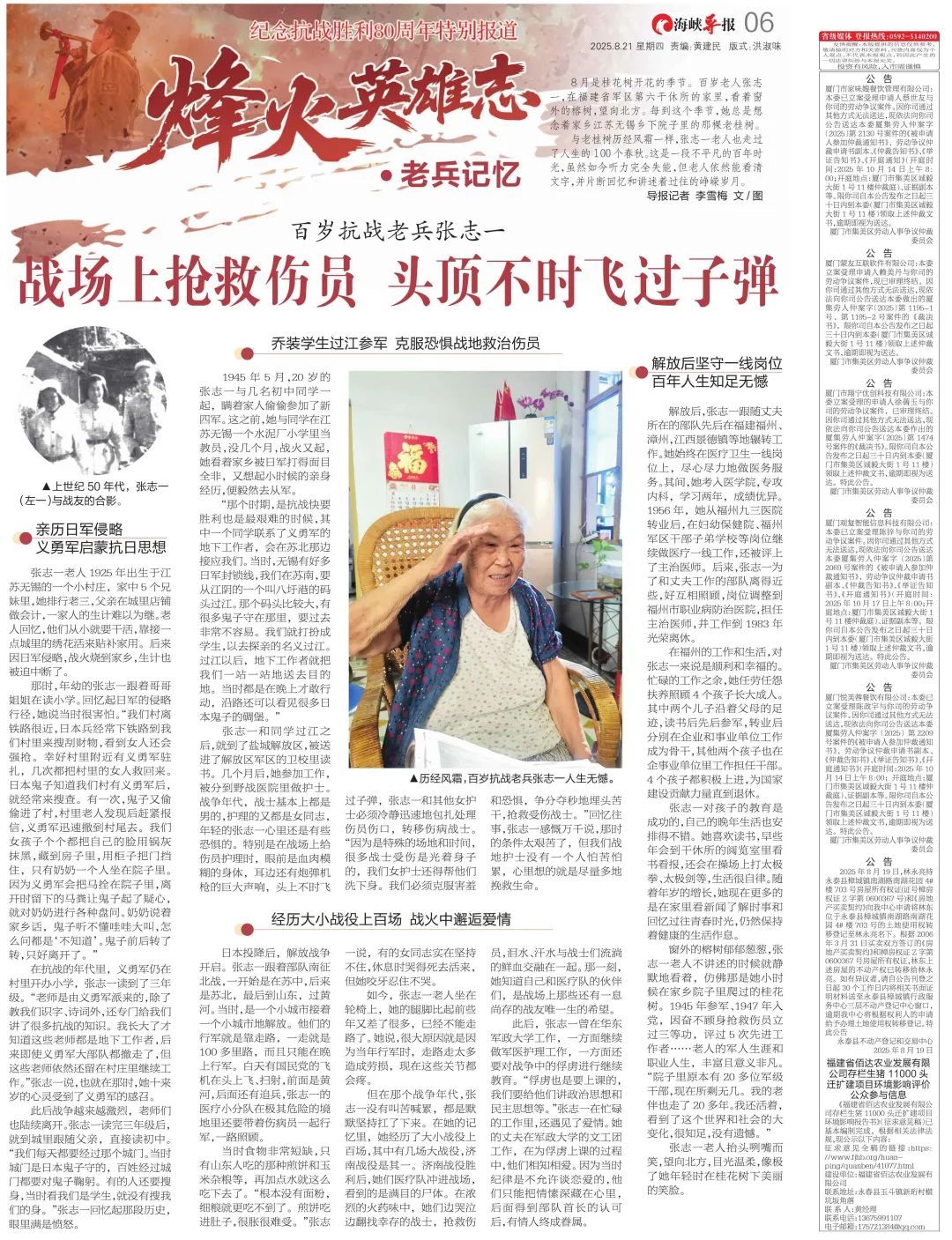 8月是桂花樹開花的季節(jié)。百歲老兵張志一,在福建省軍區(qū)第六干休所的家里,看著窗外的榕樹,望向北方。每到這個(gè)季節(jié),她總是想念著家鄉(xiāng)江蘇無錫鄉(xiāng)下院子里的那棵老桂樹。 與老桂樹歷經(jīng)風(fēng)霜一樣,張志一老人也走過了人生的100個(gè)春秋。這是一段不平凡的百年時(shí)光,雖然如今聽力完全失能,但老人依然能看清文字,并片斷回憶和講述著過往的崢嶸歲月。 親歷日軍侵略 義勇軍啟蒙抗日思想 張志一老人1925年出生于江蘇無錫的一個(gè)小村莊,家中5個(gè)兄妹里,她排行老三,父親在城里店鋪?zhàn)鰰?huì)計(jì),一家人的生計(jì)難以為繼。老人回憶,他們從小就要干活,靠接一點(diǎn)城里的繡花活來貼補(bǔ)家用。后來因日軍侵略,戰(zhàn)火燒到家鄉(xiāng),生計(jì)也被迫中斷了。 那時(shí),年幼的張志一跟著哥哥姐姐在讀小學(xué)?;貞浧鹑哲姷那致孕袕剑f當(dāng)時(shí)很害怕。“我們村離鐵路很近,日本兵經(jīng)常下鐵路到我們村里來搜刮財(cái)物,看到女人還會(huì)強(qiáng)搶。幸好村里附近有義勇軍駐扎,幾次都把村里的女人救回來。日本鬼子知道我們村有義勇軍后,就經(jīng)常來搜查。有一次,鬼子又偷偷進(jìn)了村,村里老人發(fā)現(xiàn)后趕緊報(bào)信,義勇軍迅速撤到村尾去。我們女孩子個(gè)個(gè)都把自己的臉用鍋灰抹黑,藏到房子里,用柜子把門擋住,只有奶奶一個(gè)人坐在院子里。因?yàn)榱x勇軍會(huì)把馬拴在院子里,離開時(shí)留下的馬糞讓鬼子起了疑心,就對(duì)奶奶進(jìn)行各種盤問。奶奶說著家鄉(xiāng)話,鬼子聽不懂哇哇大叫,怎么問都是‘不知道’。鬼子前后轉(zhuǎn)了轉(zhuǎn),只好離開了?!?/p> 在抗戰(zhàn)的年代里,義勇軍仍在村里開辦小學(xué),張志一讀到了三年級(jí)?!袄蠋熓怯闪x勇軍派來的,除了教我們識(shí)字、詩詞外,還專門給我們講了很多抗戰(zhàn)的知識(shí)。我長大了才知道這些老師都是地下工作者,后來即使義勇軍大部隊(duì)都撤走了,但這些老師依然還留在村莊里繼續(xù)工作?!睆堉疽徽f,也就在那時(shí),她十來歲的心靈受到了義勇軍的感召。 此后戰(zhàn)爭越來越激烈,老師們也陸續(xù)離開。張志一讀完三年級(jí)后,就到城里跟隨父親,直接讀初中?!拔覀兠刻於家?jīng)過那個(gè)城門。當(dāng)時(shí)城門是日本鬼子守的,百姓經(jīng)過城門都要對(duì)鬼子鞠躬。有的人還要搜身,當(dāng)時(shí)看我們是學(xué)生,就沒有搜我們的身?!睆堉疽换貞浧鹉嵌螝v史,眼里滿是憤怒。 喬裝學(xué)生過江參軍 克服恐懼戰(zhàn)地救治傷員 1945年5月,20歲的張志一與幾名初中同學(xué)一起,瞞著家人偷偷參加了新四軍。這之前,她與同學(xué)在江蘇無錫一個(gè)水泥廠小學(xué)里當(dāng)教員,沒幾個(gè)月,戰(zhàn)火又起,她看著家鄉(xiāng)被日軍打得面目全非,又想起小時(shí)候的親身經(jīng)歷,便毅然去從軍?!澳莻€(gè)時(shí)期,是抗戰(zhàn)快要?jiǎng)倮彩亲钇D難的時(shí)候,其中一個(gè)同學(xué)聯(lián)系了義勇軍的地下工作者,會(huì)在蘇北那邊接應(yīng)我們。當(dāng)時(shí),無錫有好多日軍封鎖線,我們在蘇南,要從江陰的一個(gè)叫八圩港的碼頭過江。那個(gè)碼頭比較大,有很多鬼子守在那里,要過去非常不容易。我們就打扮成學(xué)生,以去探親的名義過江。過江以后,地下工作者就把我們一站一站地送去目的地。當(dāng)時(shí)都是在晚上才敢行動(dòng),沿路還可以看見很多日本鬼子的碉堡。”
