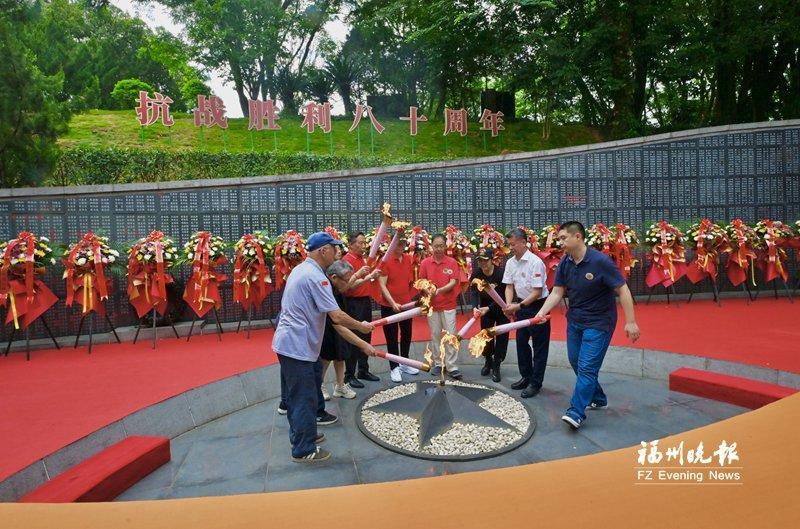 社會(huì)各界人士敬獻(xiàn)鮮花。 深切緬懷 燃傳承火種 佩戴起特制的抗戰(zhàn)勝利80周年紀(jì)念徽章,在紀(jì)念墻上鄭重簽名,與采集來的火種合影留念……8月31日8時(shí)許,福州抗日志士紀(jì)念墻前已是人頭攢動(dòng),早早來到這里的人們,以各種方式表達(dá)崇敬之情。 凝視福州抗日志士紀(jì)念墻,墻上8564個(gè)名字熠熠生輝,每一個(gè)名字背后,都是一位在民族危亡之際挺身而出的抗日志士,都有著一段可歌可泣的英雄故事?!拔腋赣H是抗日志士鄭其土?!编嵎礁稍诟赣H名字旁貼上小小的五星紅旗,“這是告慰先人的一種方式,我們沒有忘記他們,大家都沒忘記他們!”記者看到,許多抗日志士姓名旁都貼上了小小的五星紅旗。 戴著紀(jì)念徽章的兩位抗日志士——97歲姜汝煥和101歲陳世明的到來,吸引了眾人的目光。“很高興,看到很多熟人?!标愂烂餍呛堑啬贸鲈缫褜懞玫膬蓮堉杏⑽念}字贈(zèng)與福建省閩浙贛邊區(qū)革命史研究會(huì)會(huì)長凌冰。一張寫著“大力弘揚(yáng)偉大抗戰(zhàn)精神”,一張寫著“銘記歷史 緬懷先烈”,這是老人對(duì)后輩的諄諄囑托。 9時(shí)03分,穿透時(shí)空的號(hào)角聲響起。這號(hào)角,是告慰,亦是召喚,喚醒人們共同的歷史記憶?!皠倮??和平——紀(jì)念中國人民抗日戰(zhàn)爭暨世界反法西斯戰(zhàn)爭勝利80周年活動(dòng)”在號(hào)角聲中拉開帷幕。隨后,全場肅立,《義勇軍進(jìn)行曲》的激昂旋律回蕩在紀(jì)念園上空,嘉賓們向福州抗日志士紀(jì)念墻行注目禮,用最莊重的方式致敬英烈。 活動(dòng)現(xiàn)場,工作人員向抗日志士姜汝煥和陳世明獻(xiàn)花;主辦方及參與單位代表向紀(jì)念墻敬獻(xiàn)花籃并整理綬帶。朵朵鮮花寄托哀思,條條綬帶承載敬意,訴說著后人們對(duì)前輩先烈的深切緬懷。 抗戰(zhàn)的精神需要薪火相傳。現(xiàn)場大屏幕上播放的“薪火八閩”采集視頻,帶領(lǐng)大家回顧1個(gè)月來的火種采集歷程——從福州八一七烈士墓到福建省閩浙贛邊區(qū)革命紀(jì)念碑、福建省閩粵贛邊區(qū)革命紀(jì)念碑,從閩侯大湖抗戰(zhàn)遺址到陳紹寬上將故居、福州解放紀(jì)念碑、福州長江支隊(duì)紀(jì)念園,每一處都是一段悲壯史詩,每一簇火苗都是一粒不滅的精神種子。 在眾人注視下,抗日志士姜汝煥和陳世明從火種臺(tái)引出火種,并為9位抗日志士后人點(diǎn)燃火炬,再由他們共同執(zhí)火炬點(diǎn)燃“抗戰(zhàn)精神傳承長明火”。跳躍的火焰升騰而起,象征著無數(shù)抗日志士用鮮血和犧牲鑄就的抗戰(zhàn)精神將在一代又一代后人手中永續(xù)傳承、永不熄滅。