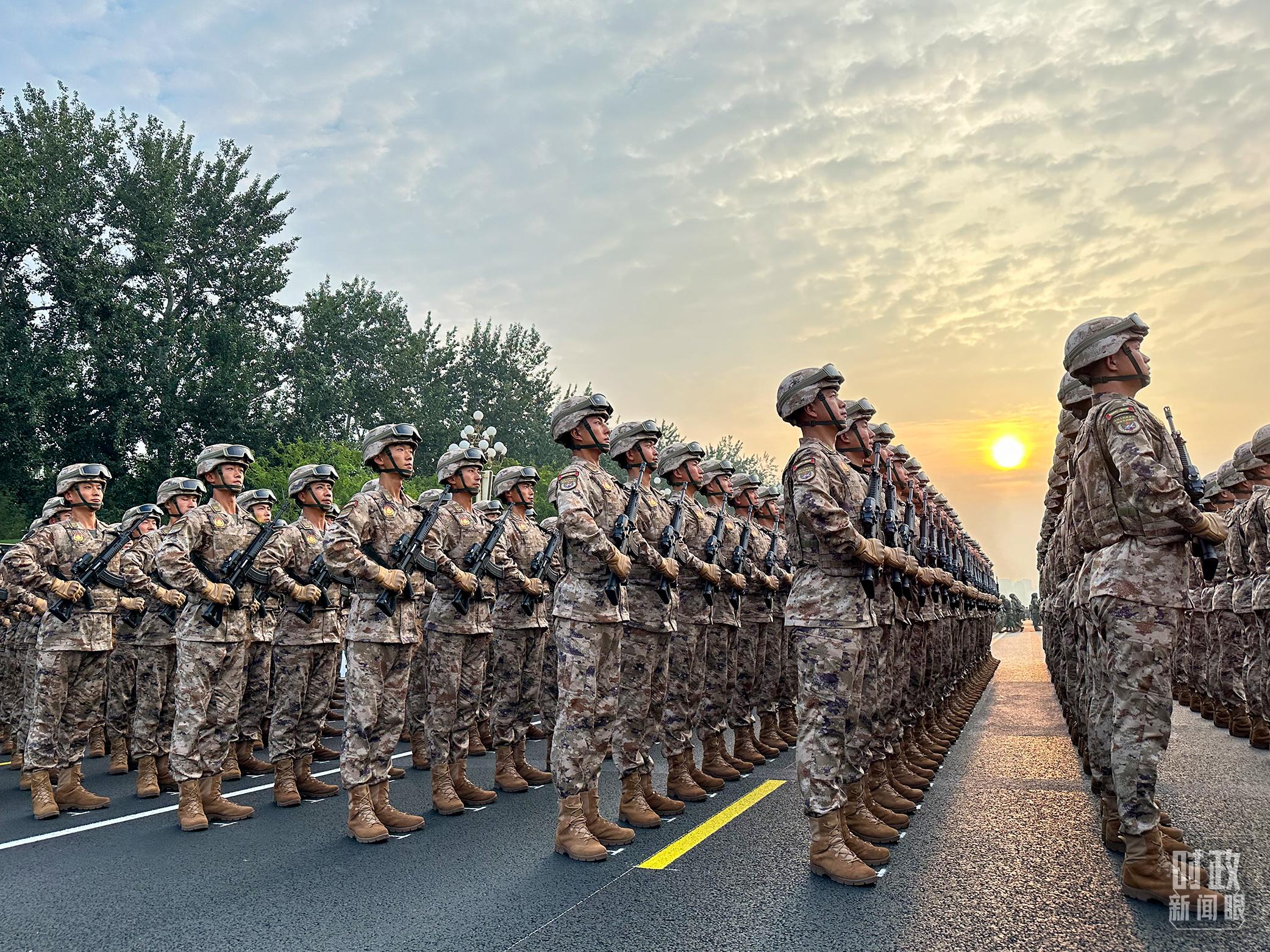 9月3日上午,紅日東升,霞光灑滿北京長安街,45個受閱方(梯)隊整齊列隊。天安門廣場上旌旗獵獵,氣象恢宏。