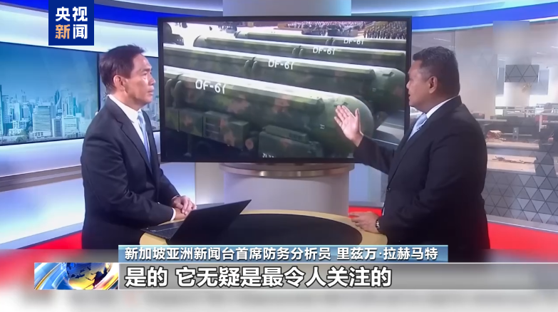 新加坡亞洲新聞臺(tái)首席防務(wù)分析員 里茲萬·拉赫馬特:是的,它無疑是最令人關(guān)注的,因?yàn)樯缃幻襟w上此前彩排的畫面中,它都沒有出現(xiàn)過。我預(yù)計(jì)它的射程要比"東風(fēng)-41"更長。