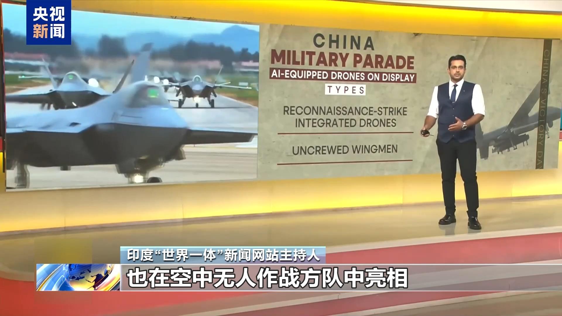 印度"世界一體"新聞網(wǎng)站主持人:新型人工智能技術(shù)無人機(jī),也在空中無人作戰(zhàn)方隊(duì)中亮相,包括察打一體無人機(jī),無人僚機(jī),艦載無人直升機(jī)等裝備。