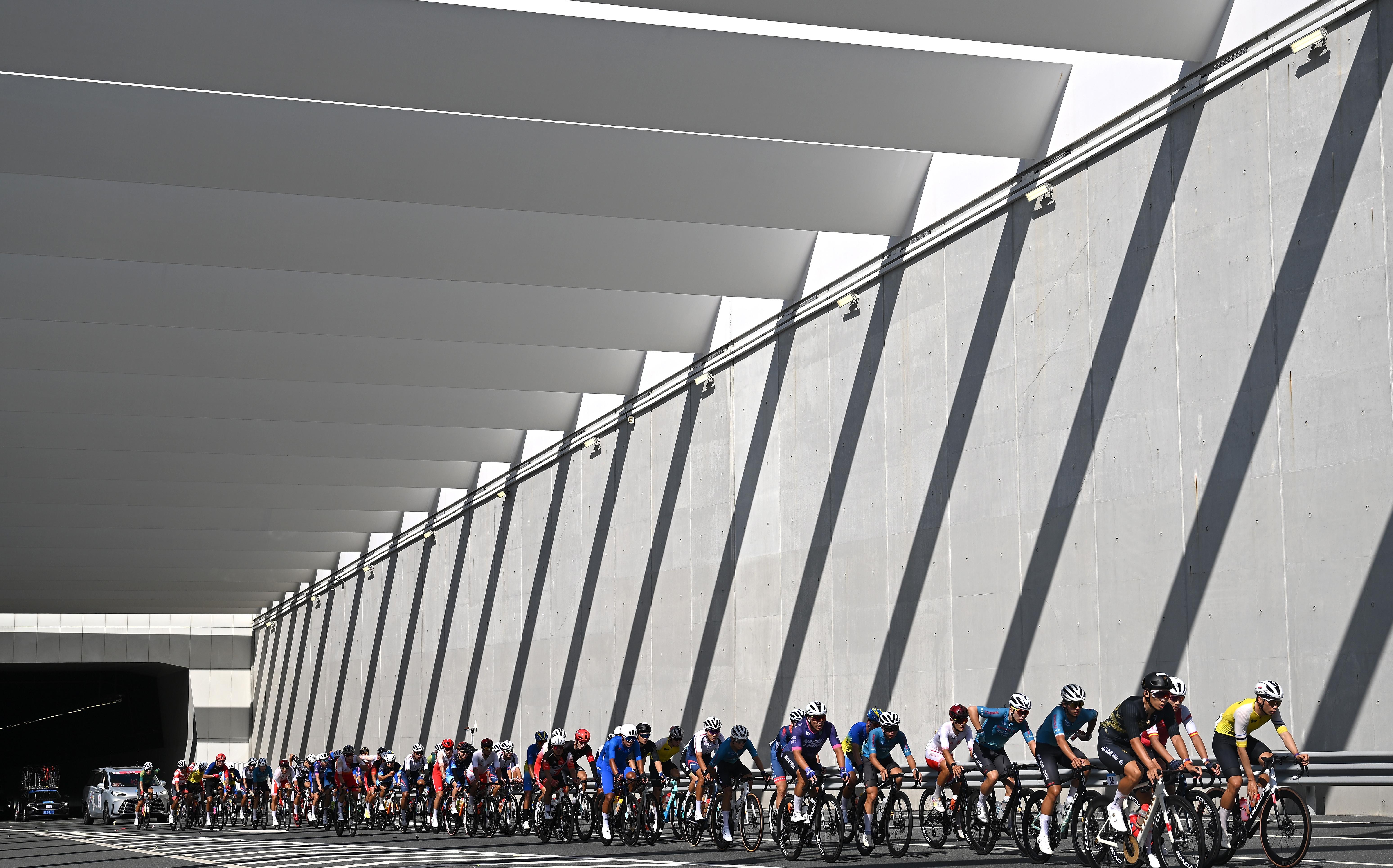 11月8日,在第十五屆全國運動會公路自行車男子個人賽決賽中,參賽選手在港珠澳大橋騎行。新華社記者 梁旭 攝