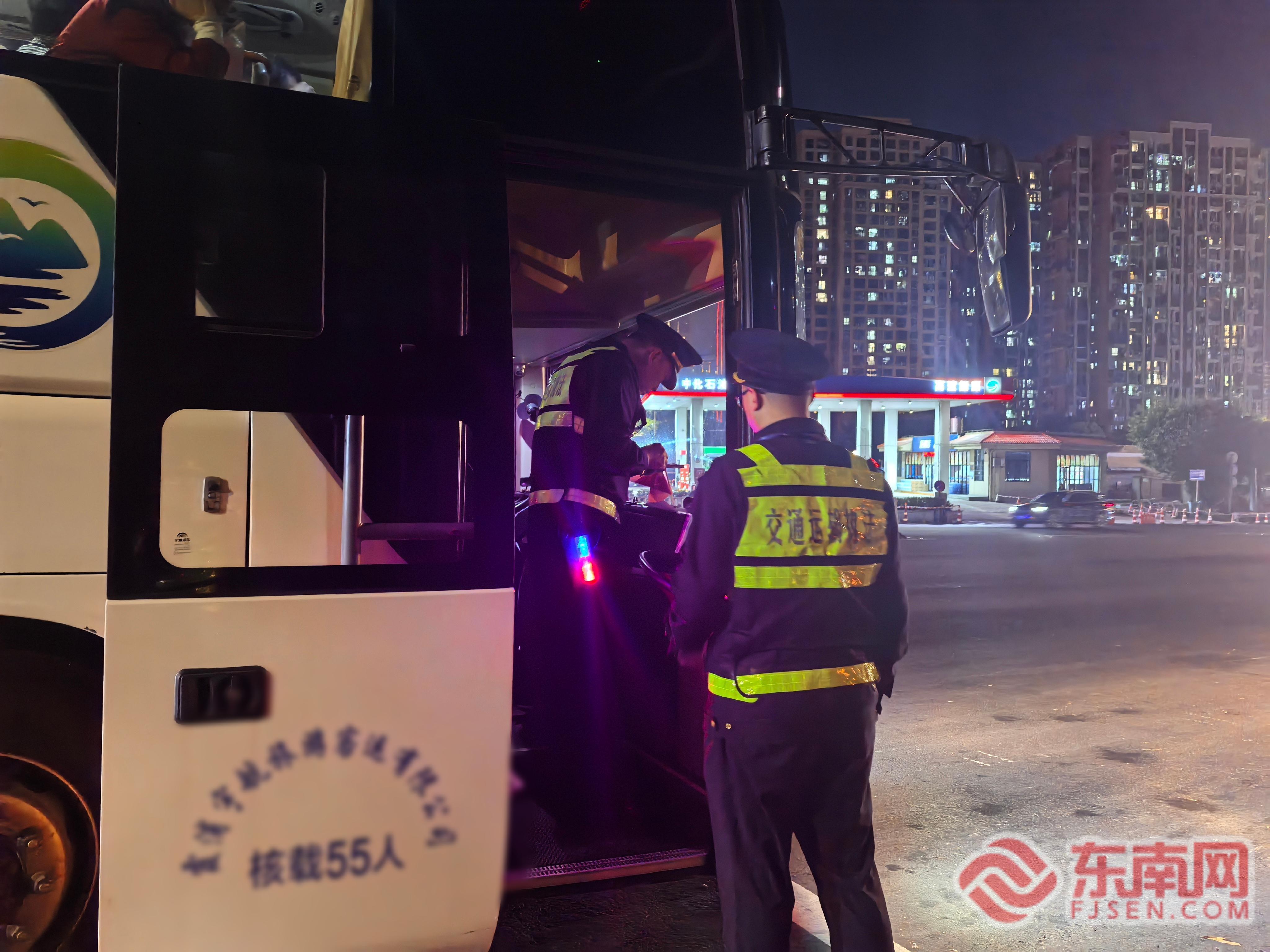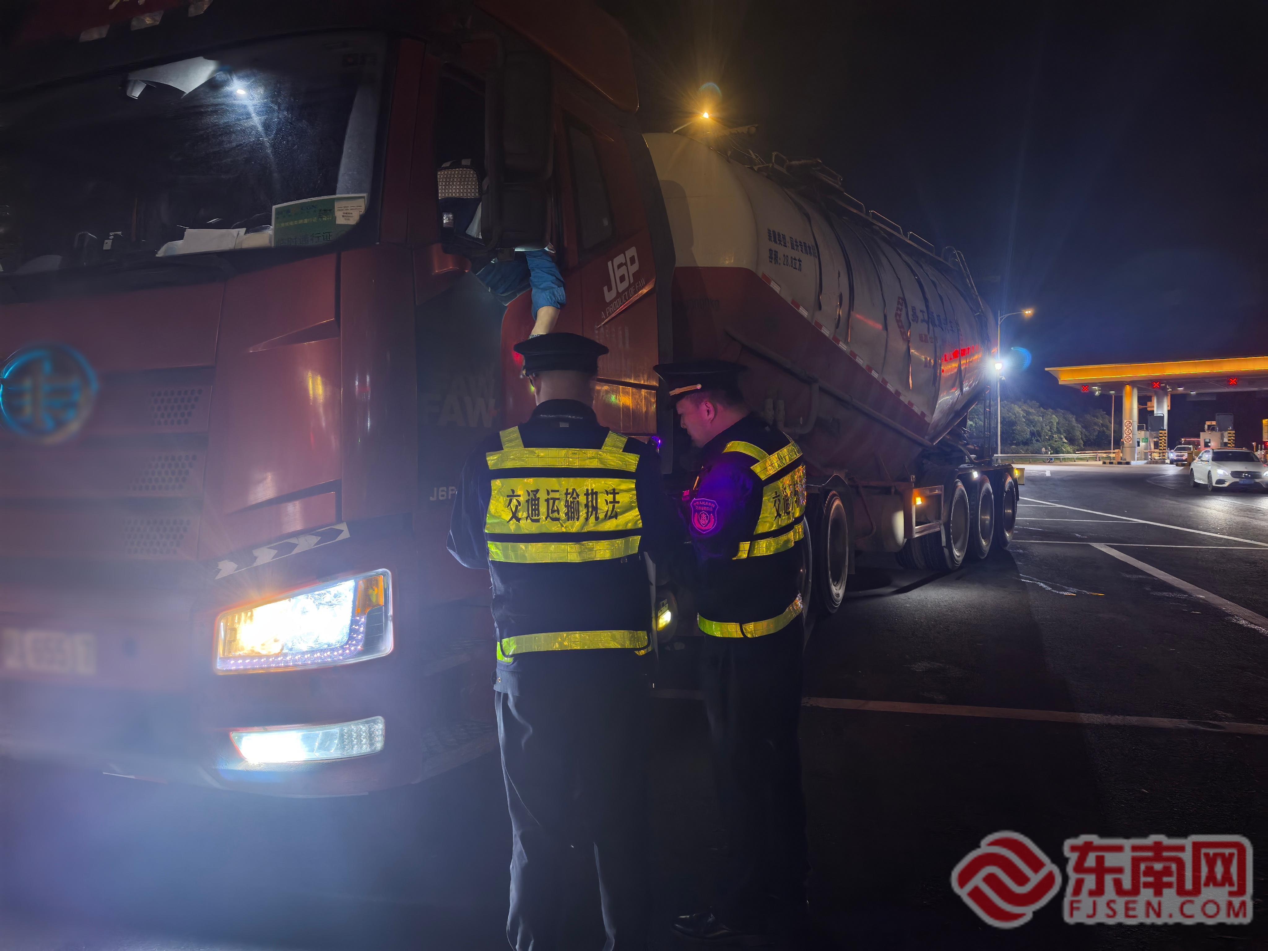 執(zhí)法檢查。寧德高速執(zhí)法支隊供圖 行動期間,霞浦中隊以牙城、鹽田、霞浦等車流量較大的收費(fèi)站為關(guān)鍵節(jié)點(diǎn),科學(xué)調(diào)配執(zhí)法力量,優(yōu)化檢查方案。為確保執(zhí)法覆蓋面與威懾力,中隊采用了“白+黑”勤務(wù)模式,在日間常態(tài)化檢查的基礎(chǔ)上,重點(diǎn)強(qiáng)化了夜間和凌晨時段的巡查頻次與力度,實現(xiàn)了對重點(diǎn)路段、重點(diǎn)時段運(yùn)輸行為的有效監(jiān)管。