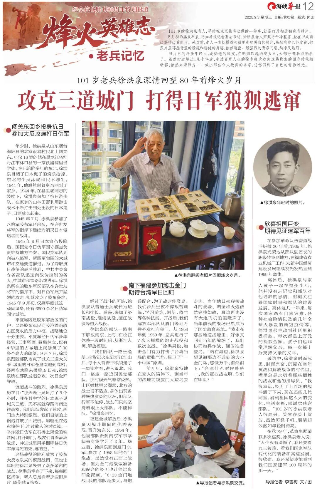 編者按: 為紀(jì)念中國(guó)人民抗日戰(zhàn)爭(zhēng)暨世界反法西斯戰(zhàn)爭(zhēng)勝利80周年,深入挖掘抗戰(zhàn)老兵事跡,傳承紅色基因,省退役軍人事務(wù)廳聯(lián)合各地市退役軍人事務(wù)部門(mén)開(kāi)展走進(jìn)抗戰(zhàn)老兵家庭,重溫抗戰(zhàn)歷史系列活動(dòng)。廳官網(wǎng)官微開(kāi)辟“致敬抗戰(zhàn)老兵”專(zhuān)欄對(duì)此進(jìn)行系列宣傳,今日推出《百歲老兵徐洪泉:攻克三道城門(mén) 打得日軍狼狽逃竄》的故事。 徐洪泉翻閱老照片回顧烽火歲月 101歲的徐洪泉老人,平時(shí)在家里最喜歡做的一件事,就是打開(kāi)相冊(cè)翻看老照片。 8月初的盛夏早晨,得知記者要去采訪(fǎng),徐洪泉老人穿戴得干凈整齊,坐在書(shū)桌前邊等待邊看照片。采訪(fǎng)前,老人一直撫摸著相冊(cè)里那些黑白的照片,雖然有些已經(jīng)發(fā)黃,但照片里那些青澀的臉龐和矯健的身姿,依然透出一股強(qiáng)烈的青春氣息,純凈又熱烈。 照片里的許多年輕人,是徐老的戰(zhàn)友,在硝煙四起的戰(zhàn)火里,大部分都?jí)蚜覡奚?。雖然時(shí)過(guò)境遷,幾十年后,走過(guò)百歲人生的徐老每次看到這些戰(zhàn)友的面容時(shí)依然動(dòng)容,依然對(duì)著照片一一喊出那些令人敬仰的名字,仿佛回到了自己的青春時(shí)光。 闖關(guān)東回鄉(xiāng)投身抗日 參加大反攻痛打日偽軍 年少時(shí),徐洪泉從山東煙臺(tái)海陽(yáng)縣的老家跟著村民北上闖關(guān)東。年僅16歲的他在黑龍江省牡丹江市林口縣的一家鐵器鋪里當(dāng)學(xué)徒。在已淪陷多年的東北,徐洪泉目睹了日本鬼子的燒殺搶掠、東北的生靈涂炭和民不聊生。1941年,他毅然跟著鄉(xiāng)親回到了家鄉(xiāng)。1944年,在縣里老同志的鼓勵(lì)下,徐洪泉參加了抗日游擊隊(duì),在家鄉(xiāng)的山林田野利用游擊戰(zhàn)術(shù)不斷打擊到處出沒(méi)的日本鬼子,日漸成長(zhǎng)起來(lái)。 1945年7月,徐洪泉參加了八路軍膠東軍區(qū)部隊(duì),在許世友將軍的指揮下繼續(xù)為消滅日本侵略者而戰(zhàn)斗。 1945年8月日本宣布投降后,國(guó)民黨令日偽軍固守?fù)?jù)點(diǎn)負(fù)責(zé)維持地方治安,國(guó)民黨軍隊(duì)則向被八路軍、新四軍包圍的大城市和交通要道推進(jìn)。為了奪取抗日戰(zhàn)爭(zhēng)的最后勝利,中共中央命令各部隊(duì)迅速向敵偽控制的各大、中城市和鐵路沿線(xiàn)進(jìn)軍。徐洪泉所在的膠東軍區(qū)部隊(duì)在許世友將軍的指揮下,對(duì)日偽軍展開(kāi)猛烈的攻擊,相繼攻克了膠東多地。至1945年9月初,僅剩平度城這一頑固堡壘,還有6600余名日偽軍固守城池。 徐洪泉年輕時(shí)的照片 平度城既是膠東解放區(qū)的門(mén)戶(hù),又是膠東軍民向膠濟(jì)鐵路敵占區(qū)反攻的后方中樞,戰(zhàn)略地位十分重要。平度城經(jīng)日偽軍多年經(jīng)營(yíng),工事堅(jiān)固,碉堡林立,僅有4華里的古城墻上就修筑了30多個(gè)高大的碉堡。9月7日,徐洪泉跟隨部隊(duì)攻克了城關(guān)三道大關(guān)卡,城里的日軍倉(cāng)皇南逃到高密。經(jīng)兩次勸降未果后,9日夜,徐洪泉所在部隊(duì)發(fā)起總攻,次日全殲守?cái)场?/p> 談起戰(zhàn)斗的激烈,徐洪泉?dú)v歷在目:“那天晚上足足打了8個(gè)小時(shí),駐在縣中學(xué)的日本鬼子見(jiàn)城關(guān)已破,天不亮就奪路向南逃往高密。我們部隊(duì)發(fā)起了總攻,西門(mén)炮火特別激烈,我們自制的土鋼炮打破了西城樓。爆破組在炮火掩護(hù)下,沖過(guò)敵人的封鎖線(xiàn),一舉炸毀日偽軍在石橋上架設(shè)的鐵絲網(wǎng),打開(kāi)城門(mén)。戰(zhàn)友們冒著滾滾濃煙,沖進(jìn)城里用手榴彈炸得日偽軍死傷慘重,四處逃竄?!?/p> 這場(chǎng)戰(zhàn)役的勝利成為了膠東大反攻以來(lái)的模范戰(zhàn)例,但也讓年輕的徐洪泉失去了眾多親密的戰(zhàn)友。徐洪泉幸存了下來(lái),每每回憶戰(zhàn)爭(zhēng),老人總是看著那些舊照片,既傷感又愧疚。 南下福建參加炮擊金門(mén) 期待臺(tái)灣早日回歸 經(jīng)過(guò)了戰(zhàn)斗的歷練,徐洪泉從普通士兵成長(zhǎng)為班長(zhǎng)和排長(zhǎng)。后來(lái),參加了濟(jì)南戰(zhàn)役、淮海戰(zhàn)役、渡江戰(zhàn)役等重大戰(zhàn)役。 徐洪泉的部隊(duì)一路南下解放南京、上海,在松江休整一段時(shí)間后,從浙江入閩,解放福建。 “我們部隊(duì)一路乘漁船、乘貨運(yùn)火車(chē)到浙江江山后,每個(gè)人背著干糧袋走了一星期左右,進(jìn)入閩北。我們一路走一路追國(guó)民黨部隊(duì),那時(shí)候天氣非常炎熱,山區(qū)樹(shù)林里又潮濕,北方的戰(zhàn)士很不適應(yīng),身體出現(xiàn)各種暑熱發(fā)炎的狀況,但部隊(duì)行軍不能停,戰(zhàn)友們只能堅(jiān)持著跟上大部隊(duì),不能掉隊(duì)?!毙旌槿貞?。 福建全域解放后,徐洪泉因作戰(zhàn)英勇、表現(xiàn)突出,晉升為連長(zhǎng)。1954年,他被選派至南京軍事學(xué)院進(jìn)行了為期三年的專(zhuān)業(yè)學(xué)習(xí)。畢業(yè)后,徐洪泉回到廈門(mén)31軍,參加了1958年的金門(mén)炮戰(zhàn)。雖然沒(méi)有正面上戰(zhàn)場(chǎng),但為金門(mén)炮戰(zhàn)做準(zhǔn)備和配合的經(jīng)歷也讓徐洪泉印象深刻?!?#39;8·23金門(mén)炮戰(zhàn)',我的部隊(duì)是步兵,與炮兵配合,為了戰(zhàn)時(shí)能登島,我們步兵晝夜不停艱苦訓(xùn)